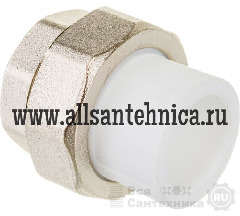 Комбинированный полипропиленовый фитинг, закладная деталь изготовлена из латуни марки ЛС-59-1. Представляет собой разъемное соединение между металлической и пластиковой трубой. Латунные части производятся методом горячего штампования, пластиковые - методом литья под давлением.