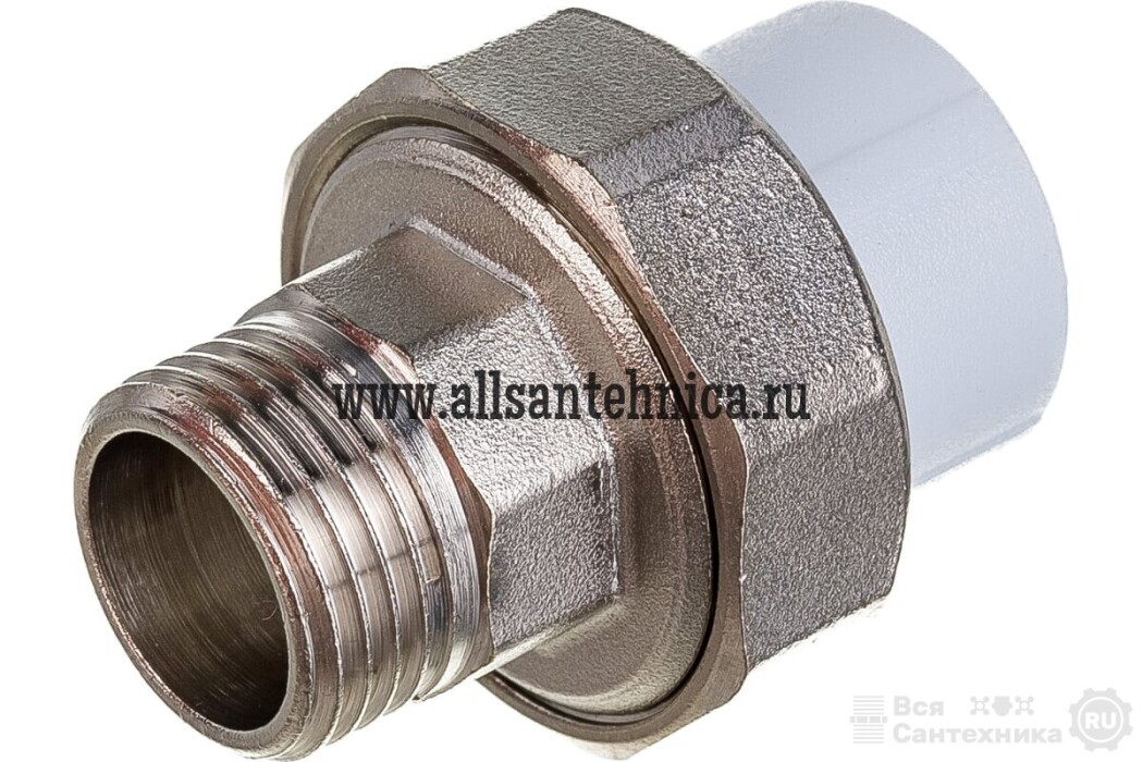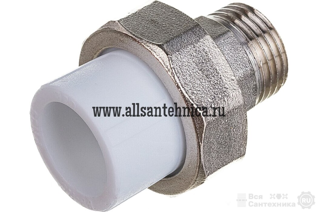 Комбинированный полипропиленовый фитинг, закладная деталь изготовлена из латуни марки ЛС-59-1. Представляет собой разъемное соединение между металлической и пластиковой трубой. Латунные части производятся методом горячего штампования, пластиковые - методом литья под давлением.