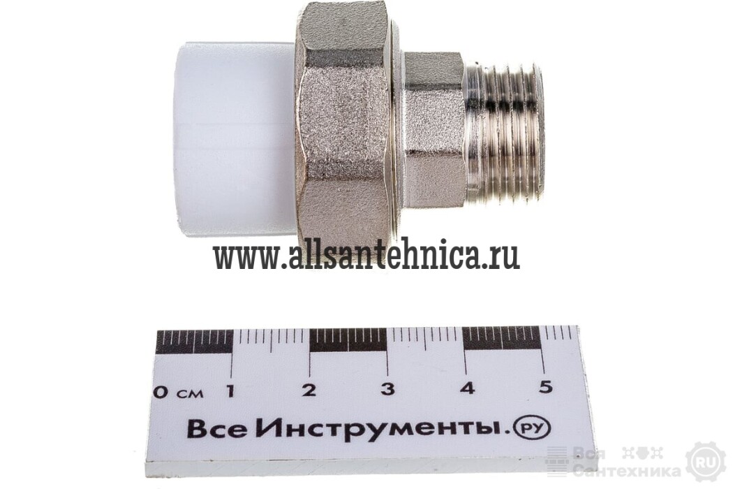 Комбинированный полипропиленовый фитинг, закладная деталь изготовлена из латуни марки ЛС-59-1. Представляет собой разъемное соединение между металлической и пластиковой трубой. Латунные части производятся методом горячего штампования, пластиковые - методом литья под давлением.