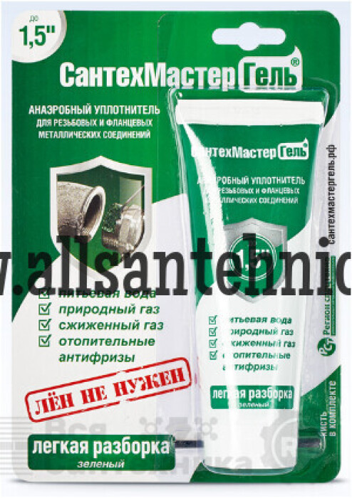 «СантехМастер Гель Зеленый» – легкоразборный (демонтаж соединений не требует усилий) герметик для новой и чистой резьбы. Используется для долгосрочного и временного уплотнения металлической резьбы диаметром до 1,5". Время полимеризации состава увеличено до 20–30 минут. Температура монтажа – от +15 °С. Поставляется в блистере. Вес – 60 или 15 г. В комплекте – кисть для нанесения герметика.