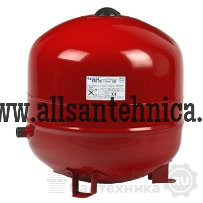 (CM.ERE) 6–50 л. Бак предназначен для компенсации температурного расширения теплоносителя, сглаживания колебаний давления и гидравлических ударов в системах отопления с температурой теплоносителя до 100 °С и рабочим давлением до 4 (модели 6–12 л), 3,5 (18, 24 л) и 6 (от 35 л включительно). В качестве теплоносителя может использоваться вода и антифриз на основе гликолей. Бак оснащен несменной мембраной из стиролбутадиенового каучука (SBR). Мембрана завальцована в фальцевое соединение частей корпуса, разделяя его на жидкостную (нижняя) и газовую (верхняя) полости. Жидкостная часть имеет присоединительный патрубок диаметром ¾", газовая – штуцер для регулирования давления. Заводское давление воздушной подушки (преднастройка) – 1,5 бара. Корпус мембранного расширительного бака выполнен из углеродистой стали и окрашен термостойкой эпоксидной эмалью красного цвета (RAL 3000). Бак предназначен для вертикальной установки. Модели объемом 35 л и более имеют установочные ножки (есть баки 35 и 50 л без ножек).