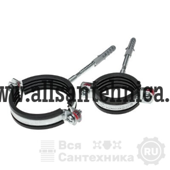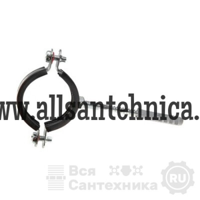 (RUS.833) Стальной кронштейн используется в качестве неподвижной опоры при креплении к несущей поверхности труб из различных материалов и представляет собой снабженный резиновым уплотнением металлический хомут с гайкой, болтом и дюбелем.