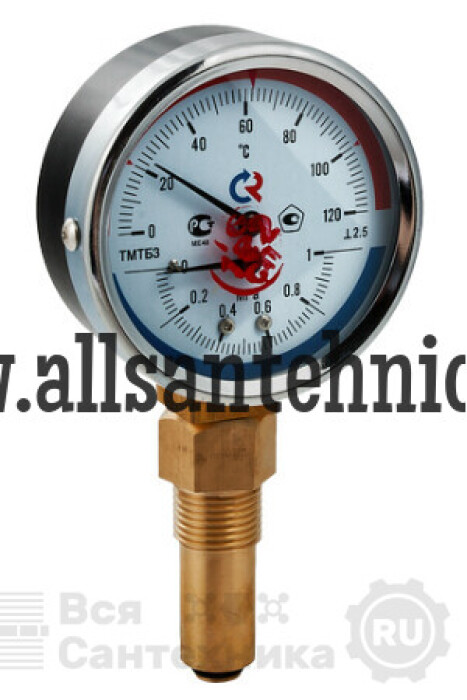 (ТМТБ-31P) Прибор предназначен для одновременного измерения избыточного давления и температуры воды и других сред, неагрессивных к сплавам меди. Он представляет собой объединенные в одном корпусе деформационный манометр и биметаллический термометр. Для снятия показаний предусмотрены две шкалы – давления и температуры. Комплектуется клапаном, позволяющим демонтировать термоманометр без разгерметизации системы. Класс точности – 2,5. Диаметр корпуса – 80 мм. Диапазон измеряемых температур – от 0 до 120 °С, давления – от 0 до 10 бар. Присоединение – радиальное (нижнее). Диаметр присоединения – 1/2".