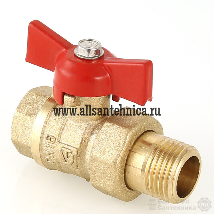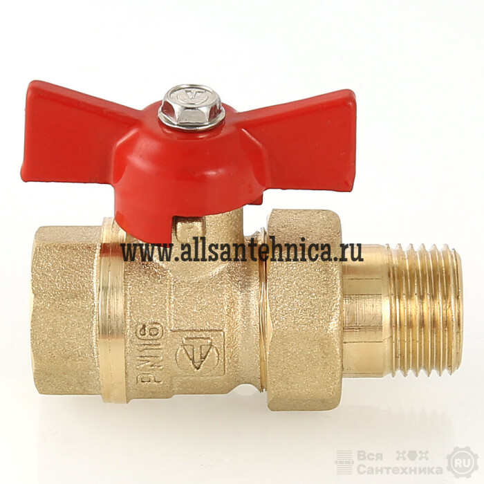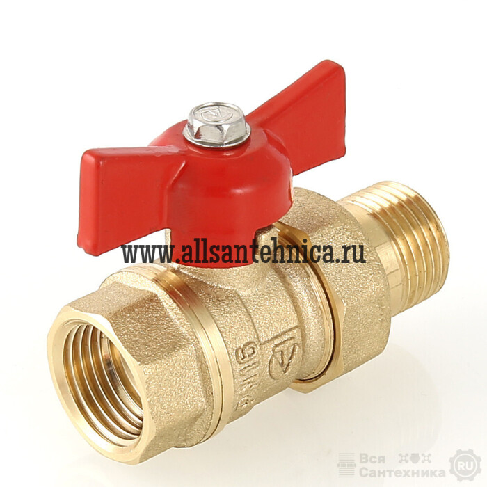 (VT.127.G) Полнопроходной ремонтопригодный шаровой кран стандартного ресурса. Выполнен из из латуни марки ЛЦ40Сд (ГОСТ 17711-93). Кран оснащен ручкой типа «бабочка», изготовленной из силумина марки АК7 (ГОСТ 1583-93) с покрытием эпоксиполиэфирной порошковой композицией красного цвета. Соединен накидной гайкой с резьбовым полусгоном. Резьба присоединений – внутренняя/наружная.