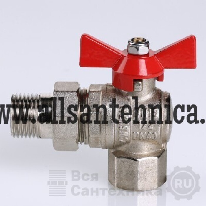 (VT.228.N) Угловой полнопроходной ремонтопригодный шаровой кран с увеличенным ресурсом. Соединен накидной гайкой с резьбовым полусгоном. Корпуса деталей – латунные, никелированные. Кран оснащен ручкой типа «бабочка» с утолщенной стенкой из алюминиевого сплава и эпоксидным покрытием красного цвета. Резьба присоединений – внутренняя/наружная.