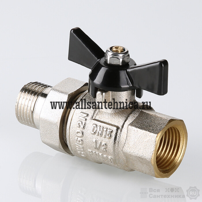 (VT.327.N) Полнопроходной усиленный шаровой кран. Рекомендуется к применению в случаях, когда на арматуру возможна передача изгибающих моментов из-за несоосности или температурных деформаций трубопроводов. Материал корпуса и затвора – латунь CW602N, стойкая к вымыванию цинка, седельных колец и сальниковых уплотнений – тефлон с термоприсадками. Ремонтопригодный. Длина резьбы увеличена для создания более плотных соединений. Кран допускается к использованию при температуре до +120 °С (снижение характеристики обусловлено наличием полусгона с уплотнением из EPDM). Тип рукоятки – «бабочка». Модель укомплектована присоединительным полусгоном. Резьба присоединений – внутренняя/наружная.