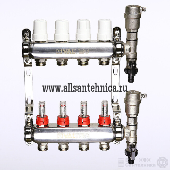 Выходы обратного коллектора блока VTс.589 оборудованы регулировочными клапанами с возможностью установки электротермических сервоприводов, подающего – настроечными клапанами с расходомерами (ротаметрами). Коллекторы оснащены воздухоотводчиками с отсекающими клапанами, дренажными кранами. В комплект входит пара сдвоенных кронштейнов VTc.130.IN.