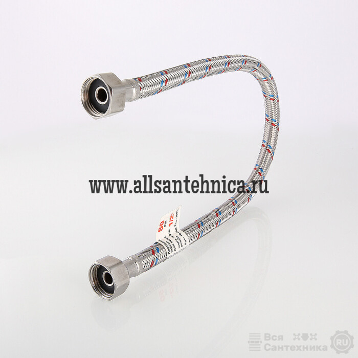 Подводки гибкие для воды VTf.001.IS рассчитаны на эксплуатацию при рабочем давлении 10 бар (максимальное давление – 20 бар) и температуре от 1 до 95 °C (максимальная температура – 100 °C). Внутренний диаметр шланга – 8,5 ± 0,5 мм. Закладной ниппель, накидные гайки, пресс-гильзы и оплетка подводок изготовлены из нержавеющей стали AISI 304. Использование ниппеля из нержавеющей стали позволило исключить излом этого элемента, повысить надежность всего изделия.