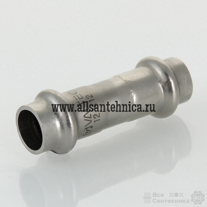 (VTi.903.I) Двухраструбная пресс-муфта из нержавеющей стали предназначена для соединения тонкостенных стальных труб в системах водоснабжения, отопления, других инженерных и технологических установках с рабочей температурой до 120 °С. Номинальное давление – 16 бар.