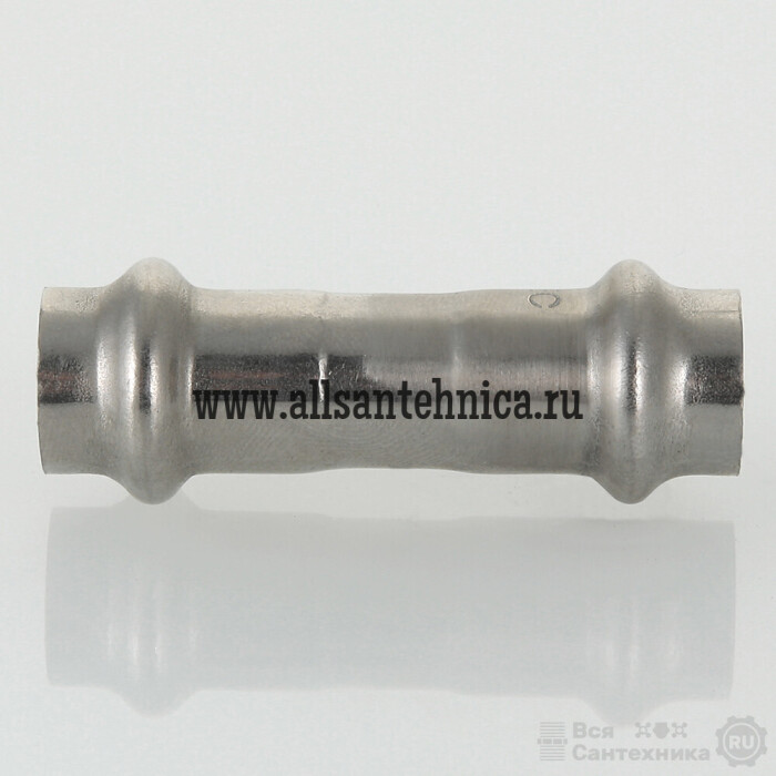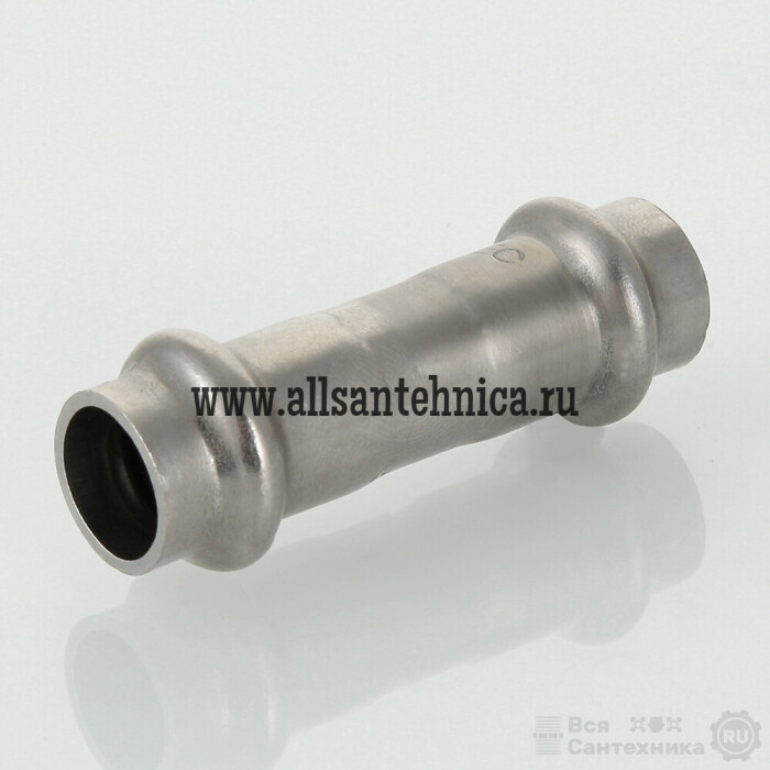 (VTi.903.I) Двухраструбная пресс-муфта из нержавеющей стали предназначена для соединения тонкостенных стальных труб в системах водоснабжения, отопления, других инженерных и технологических установках с рабочей температурой до 120 °С. Номинальное давление – 16 бар.