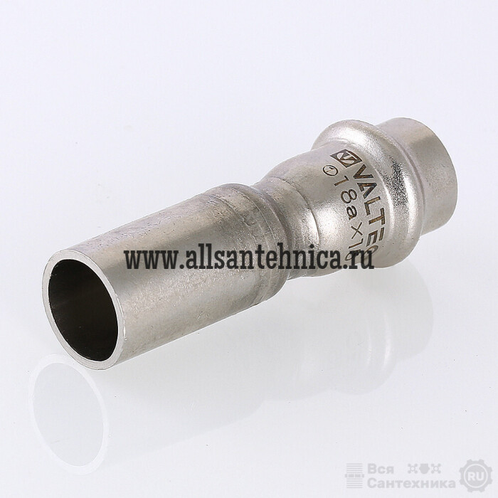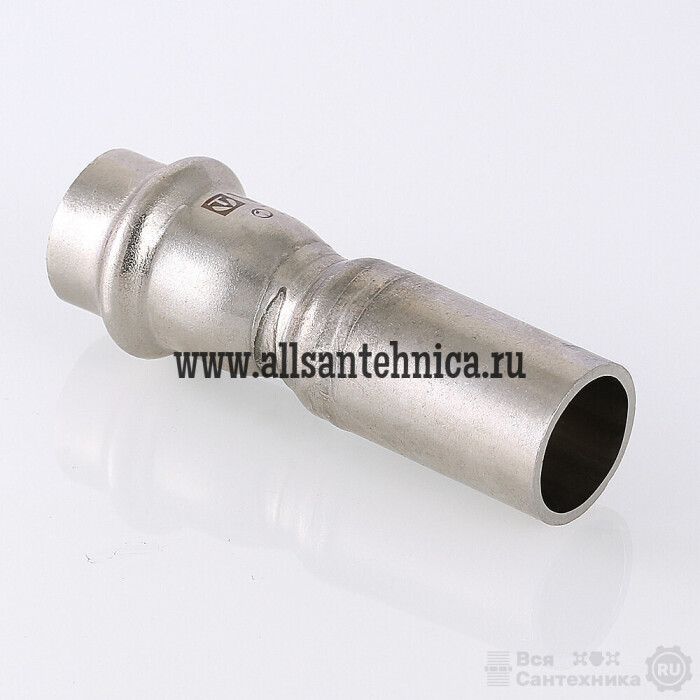 Фитинг VTi.905.l обеспечивает при монтаже переход трубопровода с одного диаметра на другой. Достоинством бесштуцерных соединителей является малый коэффициент местного сопротивления (сужение канала практически отсутствует). Фитинг рассчитан на обжатие с помощью пресс-инструмента V-профиля.
