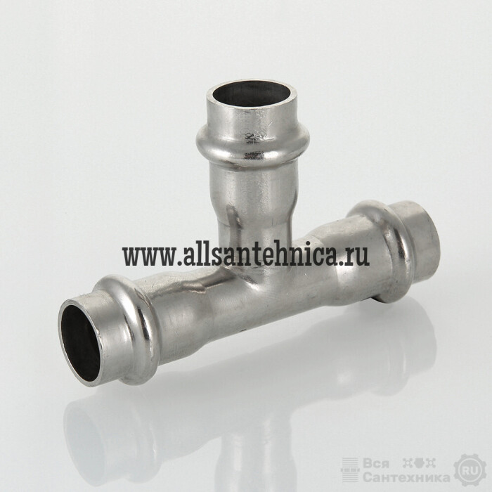 (VTi.931.I) Трехраструбный пресс-тройник из нержавеющей стали обеспечивает соединение трех тонкостенных стальных труб систем водоснабжения, отопления, иных инженерных и технологических установок с рабочей температурой до 120 °С и давлением до 16 бар. Изделие изготовлено из стали AISI 304. Материал уплотнительных колец – эластомер EPDM. Отдельно можно приобрести уплотнительные кольца из FPM (витон); в этом случае максимальная рабочая температура увеличивается до 140 °С.