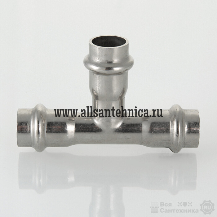 (VTi.931.I) Трехраструбный пресс-тройник из нержавеющей стали обеспечивает соединение трех тонкостенных стальных труб систем водоснабжения, отопления, иных инженерных и технологических установок с рабочей температурой до 120 °С и давлением до 16 бар. Изделие изготовлено из стали AISI 304. Материал уплотнительных колец – эластомер EPDM. Отдельно можно приобрести уплотнительные кольца из FPM (витон); в этом случае максимальная рабочая температура увеличивается до 140 °С.