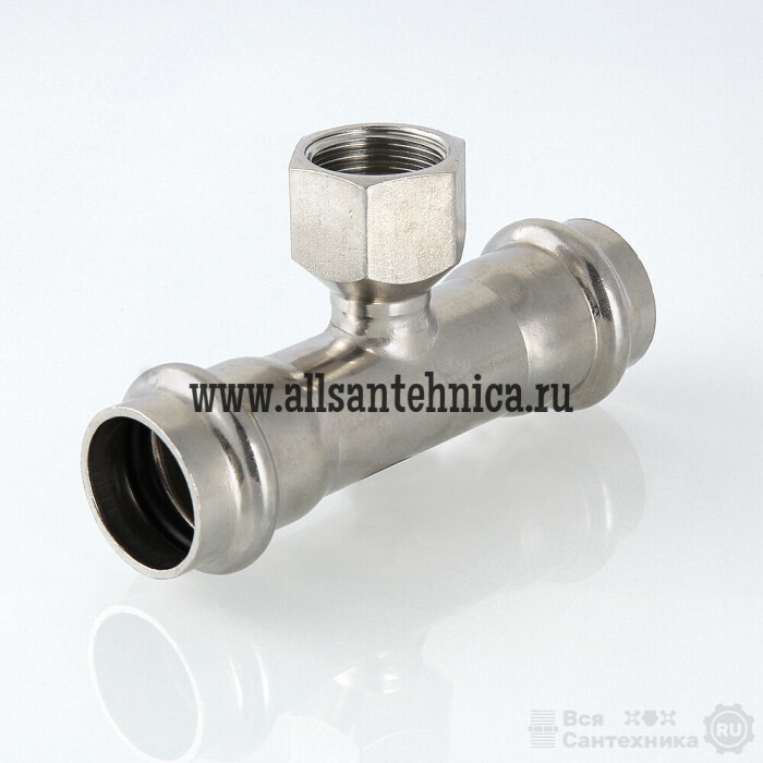 (VTi.932.I) Пресс-тройник из нержавеющей стали с внутренней резьбой предназначен для соединения тонкостенных стальных труб с резьбовым элементом системы водоснабжения, отопления, других инженерных и технологических установок. Фитинг рассчитан на эксплуатацию при максимальной рабочей температуре 120 °С. Номинальное давление – 16 бар.