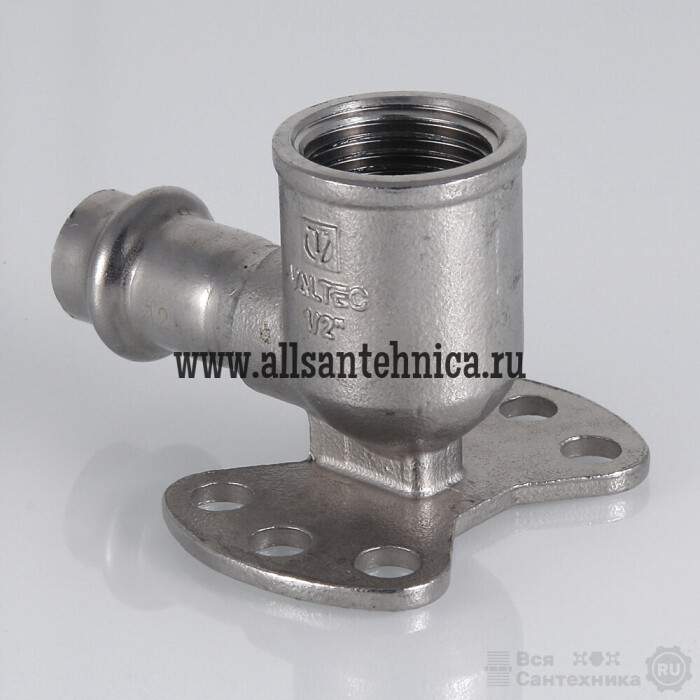 (VTi.954.I) Пресс-угольник из нержавеющей стали с переходом на внутреннюю резьбу и креплением (водорозетка) обеспечивает соединение тонкостенной стальной трубы с резьбовым элементом (в частности, патрубком сантехнического смесителя) монтируемой системы под углом 90°. Область применения пресс-водорозетки из нержавеющей стали – трубопроводы водоснабжения, отопления, иные инженерные и технологические установки с рабочей температурой до 120 °С и давлением до 16 бар.