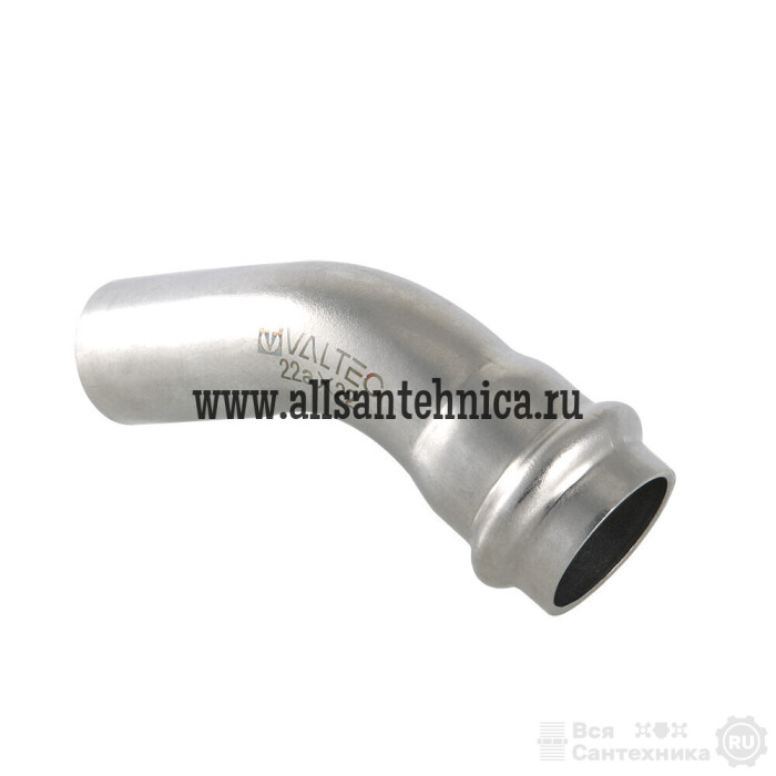 (VTi.958.I) Однораструбный пресс-угольник 45° из нержавеющей стали обеспечивает соединение тонкостенных стальных труб систем водоснабжения, отопления, иных инженерных и технологических установок с рабочей температурой до 120 °С и давлением до 16 бар. Изделие изготовлено из стали AISI 304. Материал уплотнения – эластомер EPDM. Отдельно можно приобрести уплотнительные кольца из FPM (витон); в этом случае максимальная рабочая температура увеличивается до 140 °С.