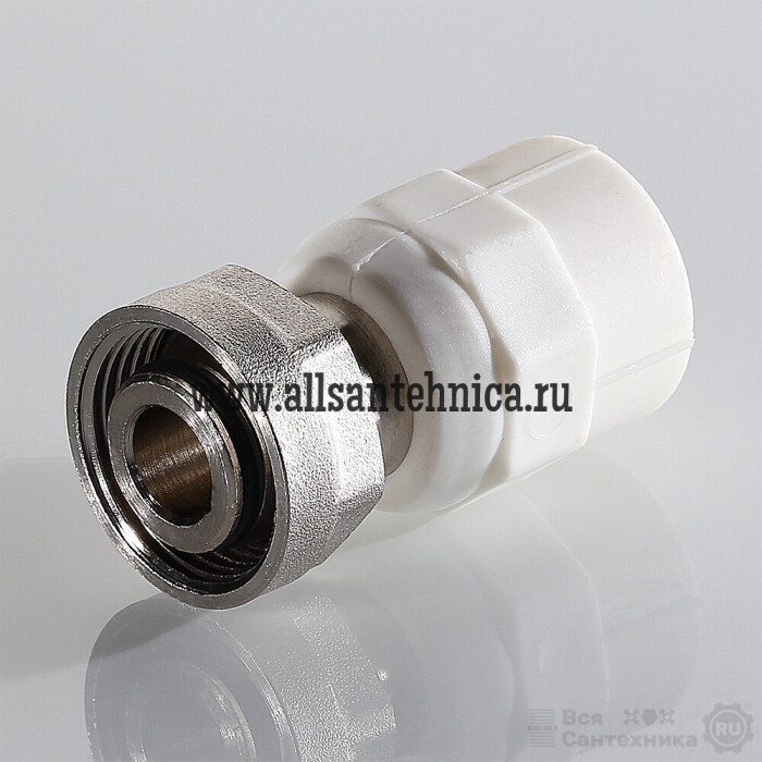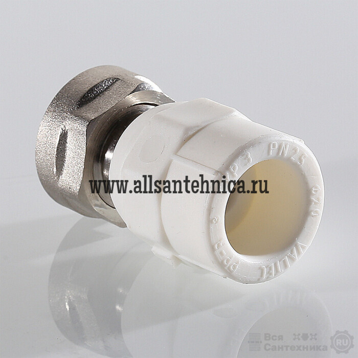 Корпус фитинга изготовлен из полипропилена, накидная гайка и закладная деталь – из латуни CW617N с нанесением никелевого гальванопокрытия. Никелирование закладной детали исключает охрупчивание полипропилена при контакте с содержащейся в латуни медью. Конструкция соединения латунной детали с полипропиленовым корпусом запатентована VALTEC. Узел дополнительно герметизирован EPDM-кольцом. Наружный диаметр присоединяемой трубы – 20 мм.