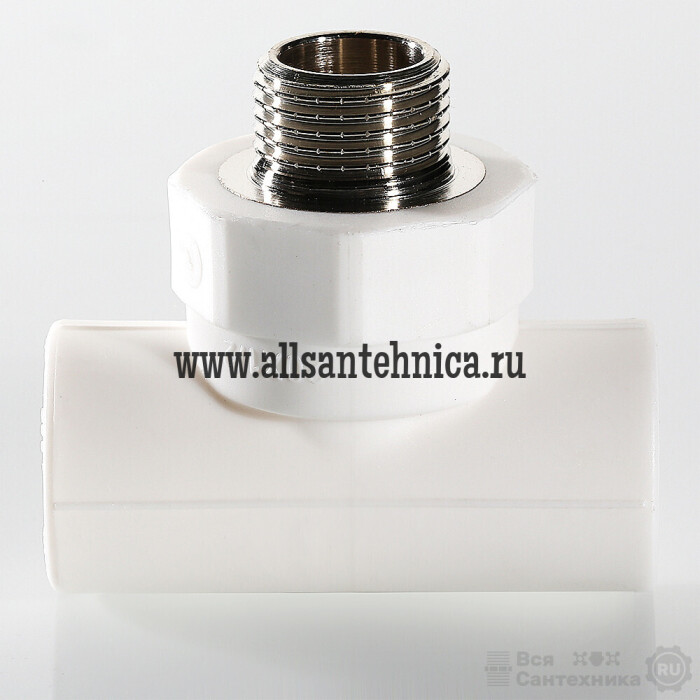 (VTp.733.0) Трехсторонний полипропиленовый фитинг для подсоединения к полипропиленовому трубопроводу компонента инженерной системы с резьбовым подключением. Резьба фитинга – наружная трубная по ГОСТу 6357.