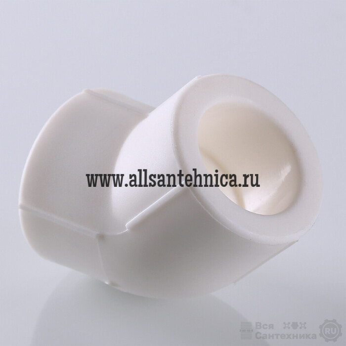 (VTp.759.0) Двухсторонний угловой полипропиленовый фитинг (отвод), позволяющий изменить направление полипропиленового трубопровода на 45°. Монтаж осуществляется методом раструбной сварки.